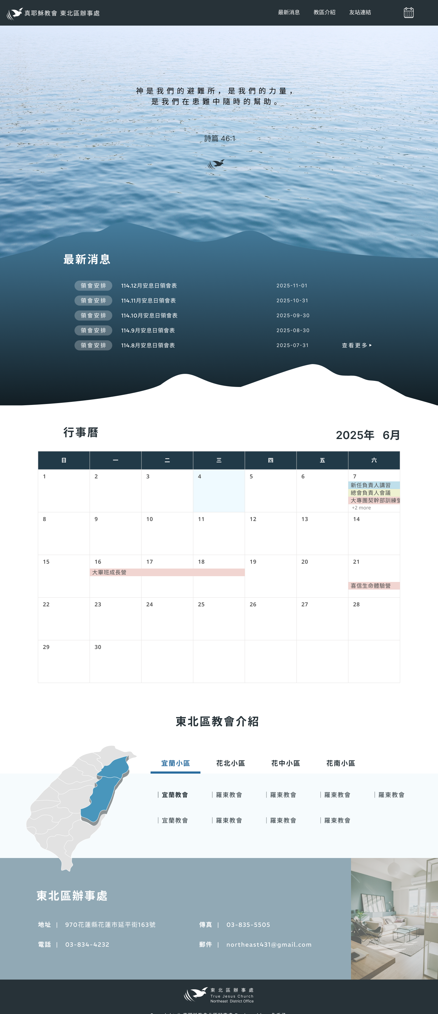 本網站提供教會相關的最新消息、行事曆與各區教會介紹。使用者可線上查詢聚會資訊、下載各式檔案。所有東北區教會的聯絡方式、公告和資源均集中於此,一站滿足所需,匯聚完整資訊與多元功能的教區平台。